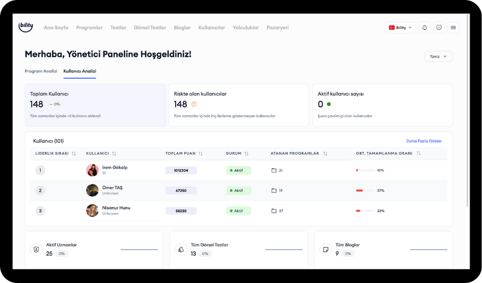 Gelişmiş bir Yönetici Paneli ile kullanıcılar ve adminler için kapsamlı analizleri inceleyin. Öğrenme deneyimini geliştirmek için ayrıntılı raporlarla ilerlemeyi takip edin, katılımı ölçün ve iyileştirme alanlarını belirleyin.